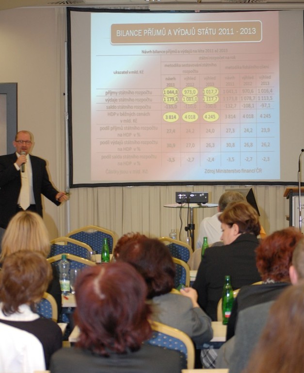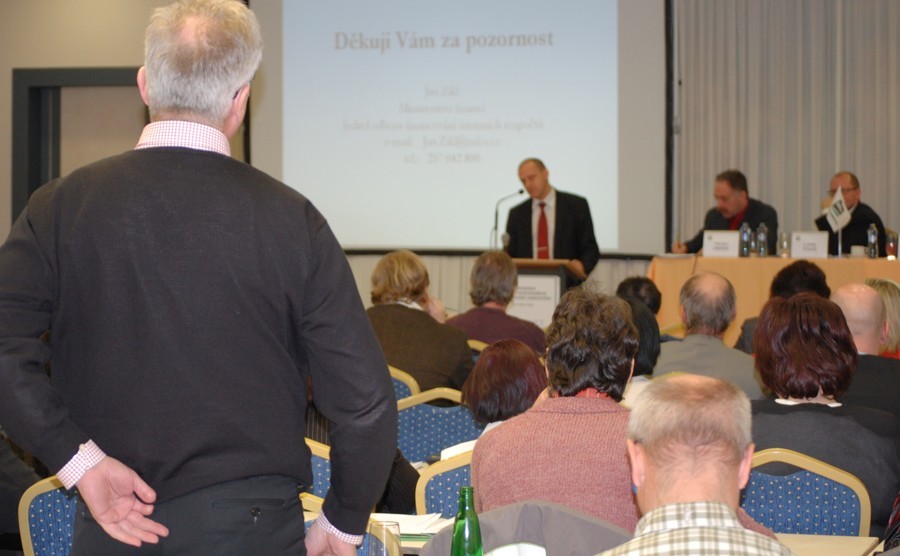 Následoval rozsáhlý příspěvek p. Jana ZIKLA, ředitele odboru financování územních rozpočtů a programového financování Ministerstva financím ČR, na téma současného rozpočtového určení daní územních samosprávných celků a možných řešení struktury daně z pohledu ministerstva. Zadlužení obcí nenarůstá, činí celkem cca 80 mld. Kč, zatímco dluh státu roste velkou rychlostí a dosahuje hodnoty cca 1,5 bil. Kč! Příjmy obcí tvoří z 54 % daňové příjmy, z 30 % dotace, z 5 % kapitálové příjmy, z 10 % nedaňové příjmy. Příjmy jsou ovlivněny množstvím základních faktorů (počet obyvatel, velikost katastru, počet podnikatelských subjektů, počet zaměstnanců obce, daň z nemovitostí, vlastní hospodářská činnost obce). Daň z nemovitostí by měla být určena zákonem, neměla by záviset na vůli zastupitelstva. Předpokládá se navýšení místního poplatku za odpady ze současných max. 500 Kč na úroveň 800 – 1000 Kč, další navýšení příjmů obce by měla zajistit novela zákona o DPH a o loteriích. Dle prohlášení vlády by se měl snížit rozdíl mezi příjmy „chudých“ obcí a „bohatých“ měst, změnit by se mělo dominantní postavení Prahy, Brna, Ostravy a Plzně. Velkým problémem je tvorba dotačních programů, které nejsou stavěny pro potřebné věci v obcích, ale pro výstavbu nesmyslných, obrovských projektů. Nicméně je nutno využít doby přidělování dotací, která pravděpodobně skončí kolem r. 2013. Nikdo však netuší, co nastane po tomto termínu, jak se budou realizovat nejrůznější projekty obcí. Dalším velkým problémem, který je před obcemi, je nutnost zavedení odpisu majetku, jeho oceňování a další souvislosti. V průběhu vystoupení a po něm následovala záplava otázek a názorů představitelů obcí.