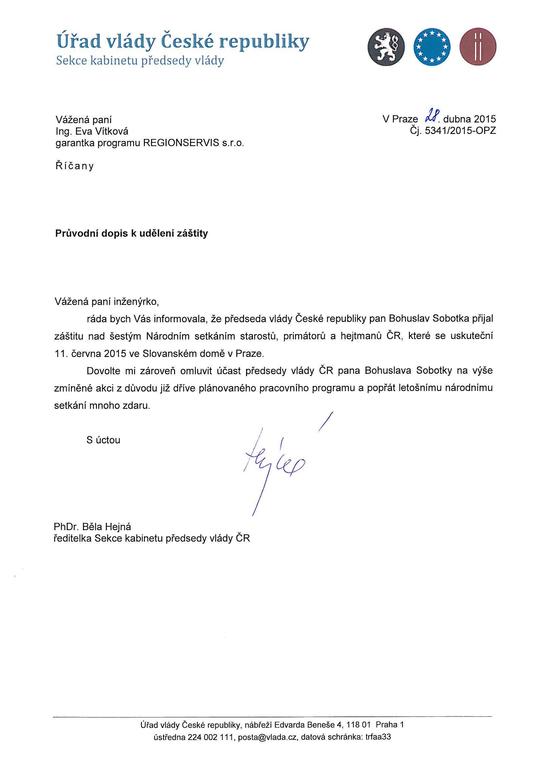 „Spolupráci státní správy a samosprávy považuji za velmi důležitou pro dobré vládnutí a pro schopnost účinně realizovat veřejnou politiku. Věřím, že naše hlavní ambice, zajistit České republice prosperitu ve všech jejích regionech, je sdílená námi všemi,“ vzkázal starostům prostřednictvím svojí poradkyně Aleny Gajdůškové předseda vlády České republiky Bohuslav Sobotka ve svém projevu více než 130 účastníkům VI. Národního setkání starostů, primátorů a hejtmanů České republiky, které se konalo 11. června 2015 ve Slovanském domě v Praze a pod taktovkou pořadatele, společnosti Regionservis, s.r.o.